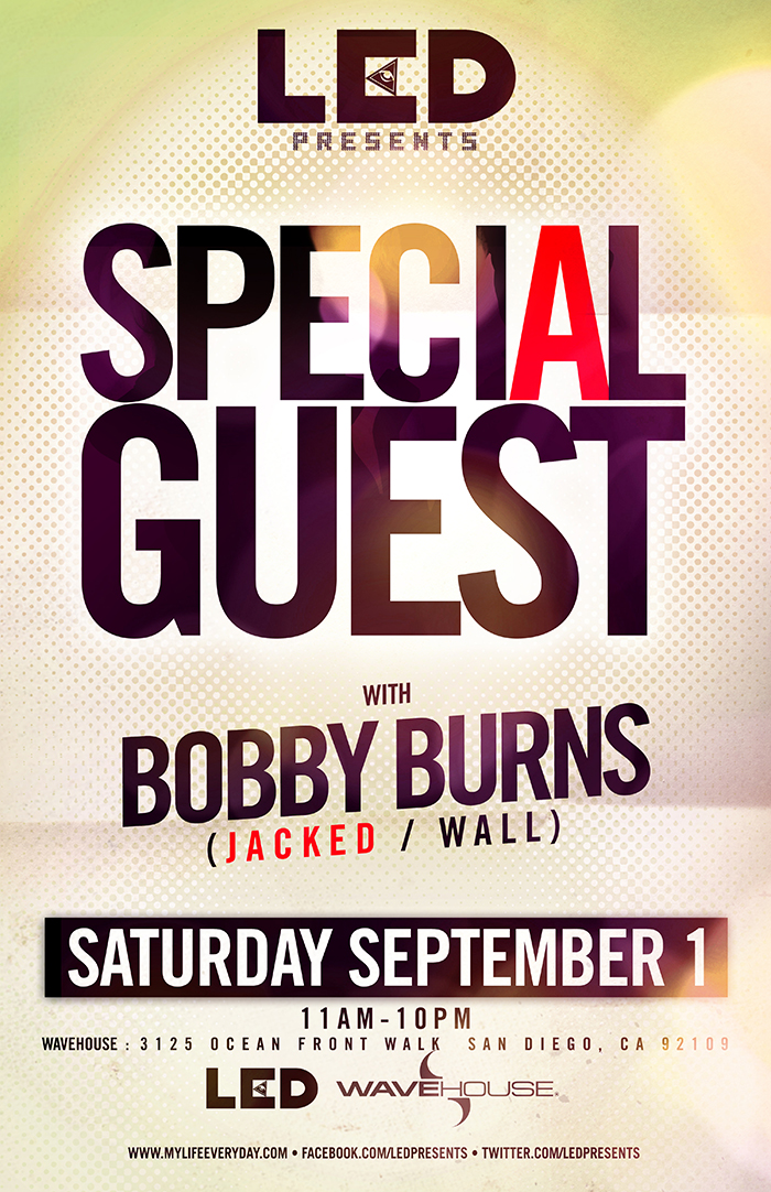 Description: LED Presents will host a special Saturday edition of Sundaze at Wavehouse, featuring a top secret special guest DJ, plus supporting sets by Bobby Burns, Fyor and Mossberg Pump. Don’t miss out, this is going to be one of the biggest names in electronic dance music! General admission tickets are $45.